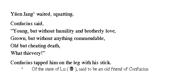 1 Юань Жан ≈ старый приятель Конфуция, отличавшийся эксцентричностью. Так, например, он осмелился петь на гробе своей матери. На этот раз Конфуция возмутило то, что Юань Жан ╚сидел, как варвар╩, т.е. скрестив ноги, что не соответствовало ритуалу.