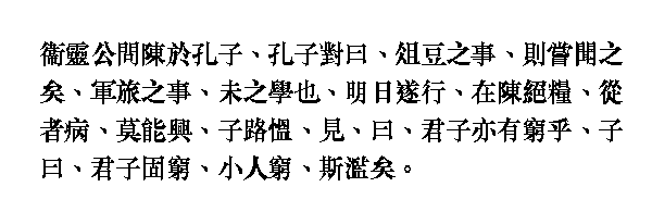 Во время пребывания в Чэнь [у Кун-цзы и учеников] иссякло продовольствие. Все сопровождавшие [Кун-цзы], изнуренные голодом, не могли подняться. Цзы Лу раздраженно спросил: