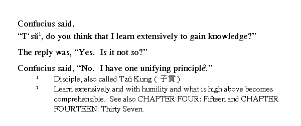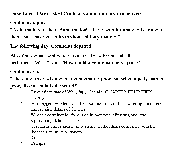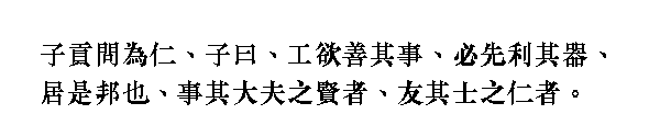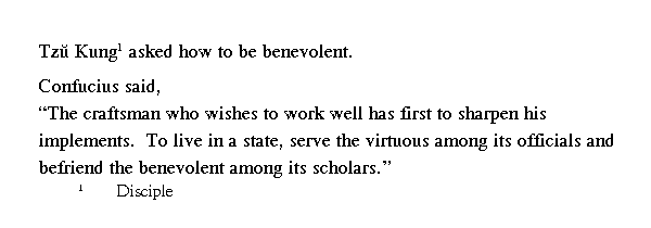 Учитель сказал: "Мастер, желающий хорошо сделать свое дело, должен прежде наточить свои инструменты. Живя в [каком-либо] государстве, надо служить самым мудрым из сановников и сближаться с самыми человеколюбивыми из образованных людей".