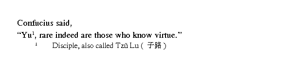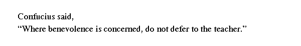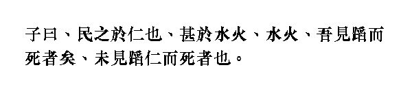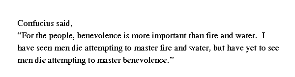 Учитель сказал: "Для людей человеколюбие важнее, чем вода и огонь. Я видел, как люди, попадая в воду и огонь, погибали. Но не видел, чтобы люди, следуя человеколюбию, погибали".