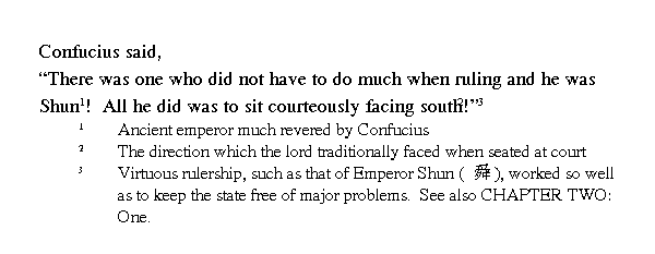 ≈Если и был правитель, добившийся порядка [в Поднебесной], не делая ничего, то им был Шунь. Чем же он занимался? Он лишь сидел в почтительной позе лицом на юг1.