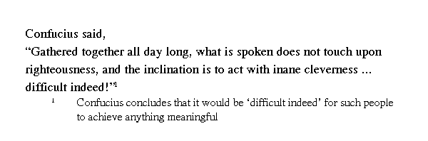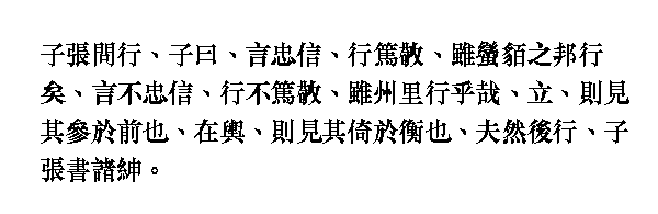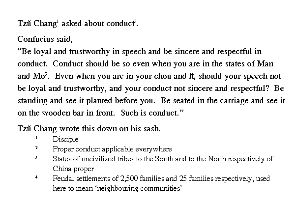 ≈ В речах будь искренним и правдивым, в поступках - честным и уважительным, и даже если отправят тебя в страну варваров, веди себя именно так. А если в речах нет искренности и правдивости, в поступках нет честности и уважительности, то допустимо ли такое даже в родных краях, родной общине1? Ты должен видеть [мысленно эти принципы] перед глазами, когда стоишь, и видеть их словно записанными на дышле, когда сидишь в повозке. Только тогда освоишь принципы правильного поведения.
