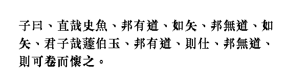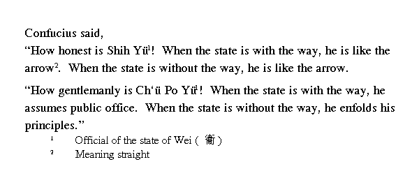 ≈ Каким прямым человеком был Ши Юй! Когда в стране царил Дао-Путь, он был прям, словно стрела; когда в стране утеряли Дао-Путь, он был также прям, словно стрела. Каким благородным мужем был Цюй Боюй! Когда в стране царил Дао-Путь, он шел служить; когда в стране утеряли Дао-Путь, он мог уйти и затаить свои способности1.