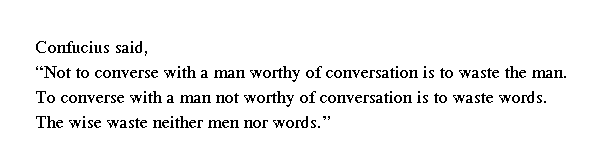 ≈ Не разговаривая с тем, с кем надо бы говорить, вы теряете людей. Разговаривая с тем, с кем лучше бы не говорить, вы теряете слова. Мудрый не теряет людей и не теряет слова.