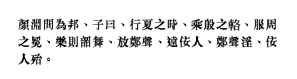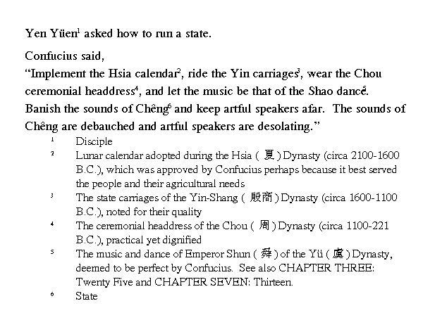 ≈ Введи календарь [династии] Ся, езди в повозках [династии] Иль, носи ритуальную шапку [династии] Чжоу, что касается музыки, то возьми [музыку] Шао и У. Запрети мелодии [царства] Чжэн, изгони льстецов: мелодии Чжэн непристойны, а льстецы опасны.