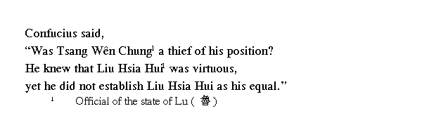 1 Цзан Вэньчжун происходил из крупной аристократической семьи Старших Суней, второе имя - Цзан Суньчэнь. Согласно все еще сохранявшейся традиции, представители аристократических родов пользовались правом наследования высших административных постов. Цзан Вэньчжун возглавлял судебное ведомство при четырех последовательно сменявшихся правителях царства Лу [Ян Боцзюнь]. Конфуций же считал, что аристократы должны быть лишены этих прав, поэтому использует здесь термин це (╚присваивать, узурпировать╩), имея в виду, что Цзан Вэньчжун незаслуженно занимает сей пост, к тому же, хорошо зная о мудрости и профессионализме своего подчиненного Люся Хуэя, Цзан Вэньчжун отказался продвигать его по службе.