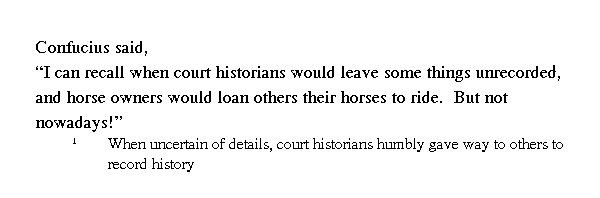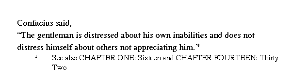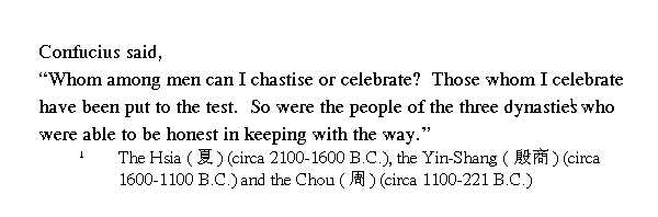 Исходя из ценностных характеристик, которыми Конфуций наделял ╚благородного мужа╩, я [Переломов - И.Б.] склонен считать, что в данном случае правитель, по мнению Учителя, должен обладать еще и ╚чувством собственного достоинства╩. Но и это условие, если не будет соблюдено главное ≈ ╚следование Правилам╩, не гарантирует успеха. Лишь сочетание всех перечисленных условий может сделать из правителя достойного мужа, а его правление ≈ образцовым.