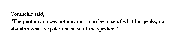 ≈ Благородный муж возвышает людей не за их слова, но он и не отвергает сказанное даже [недобродетельным] человеком.