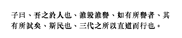 ≈ Из тех людей, с кем я общался, кого я хулил и кого хвалил? Если я и хвалил кого, то только испытав на деле. Так поступал народ Трех династий1, поэтому все Три династии шли праведным Дао-Путем.