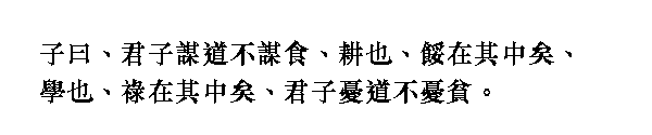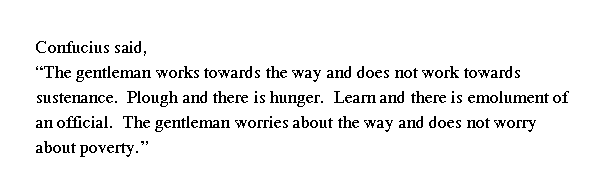 ≈ Благородный муж думает о Дао-Пути и не думает о еде. У тех, кто пашет землю, случается и голод. Тем, кто учится, выпадает и жалованье. Благородного мужа заботит обретение Дао-Пути и не заботит бедность.