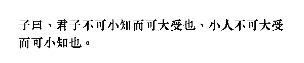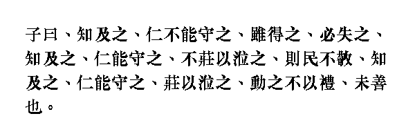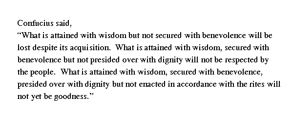 ≈ Если то, что [ты] можешь достичь с помощью [своих] знаний, не опирается на человеколюбие, то достигнутое будет утрачено. Если то, что [ты] можешь достичь с помощью своих знаний, опирается на человеколюбие, но используется при управлении народом без соблюдения чувства собственного достоинства, народ не будет почтителен. Если то, что [ты] можешь достичь с помощью своих знаний, опирается на человеколюбие и используется с чувством собственного достоинства при управлении народом, но без соблюдения Правил, значит, [ты] еще далек от совершенства1.