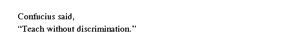 1 ╚...не может быть различий по происхождению╩ ≈ в тексте у лэй; у ≈ отрицание, лэй означало сословную принадлежность, категорию. В комментаторской литературе это суждение трактуется как утверждение принципа равных возможностей. Учитель принимал на учебу любого желающего, взимая порой минимальную плату [╚связку сушеного мяса╩ √ И.Б.]. Ян Боцзюнь трактует у лэй более расширительно ≈ ╚независимо от социального происхождения, места проживания и т.п.╩.