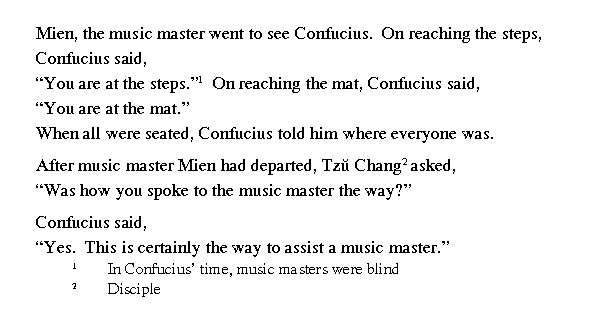 Наставник по музыке слепой Мянь1 пришел навестить Учителя. Когда он подошел к крыльцу, Учитель сказал:
