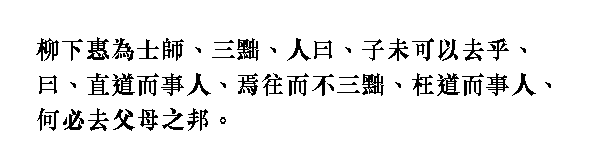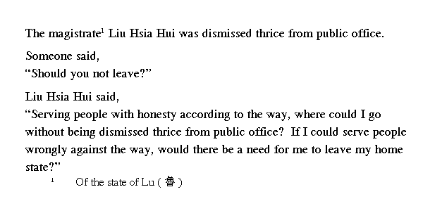 ≈ Если служишь людям, следуя по прямому Дао-Пути, то где бы ни служил, все равно лишат должности. Если служишь людям, следуя по кривому Дао-Пути, то ни к чему и покидать родное государство.