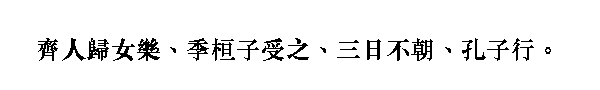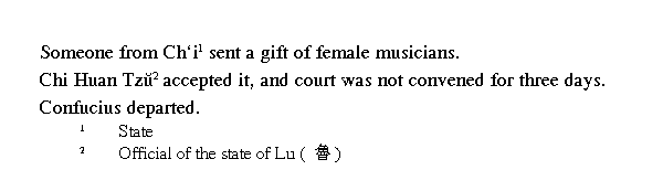 1 Согласно существовавшему в древнем Китае дворцовому ритуалу, во время каждой трапезы должна была исполняться определенная музыка. Руководившие этим музыкальным церемониалом музыканты именовались соответственно очередному приему пищи: ╚при завтраке╩, ╚при обеде╩, ╚при ужине╩. Три могущественные патронимии царства Лу распространили это ╚царское право╩ и на свои уделы, и музыканты в знак протеста бежали в другие царства. А поскольку распорядители ритуальной музыки ценились высоко, то им не грозила безработица.