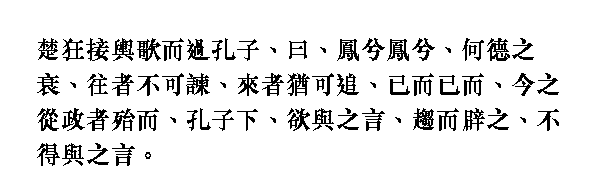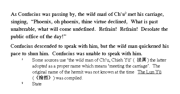 Кун-цзы сошел с повозки, намереваясь побеседовать с ним, однако тот быстро удалился, и Кун-цзы не смог с ним побеседовать.
