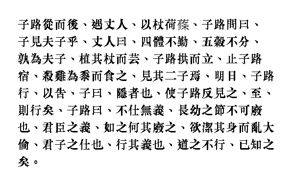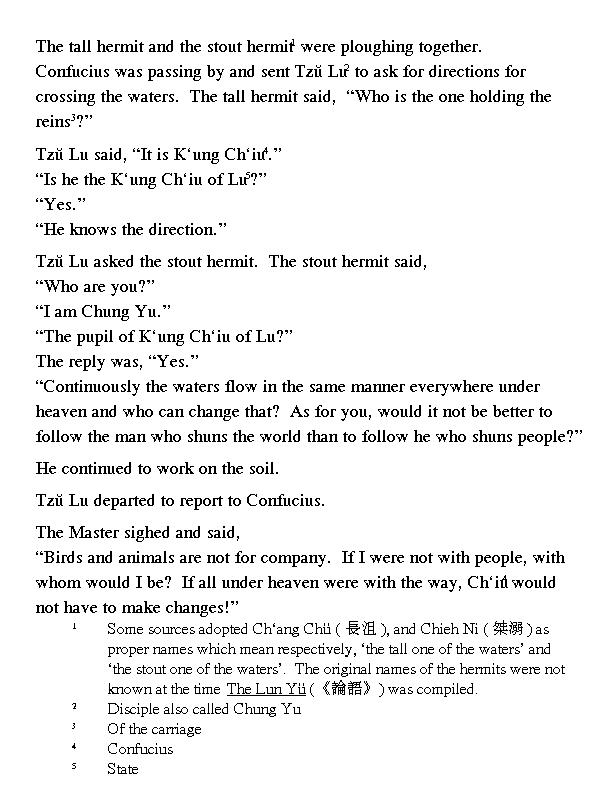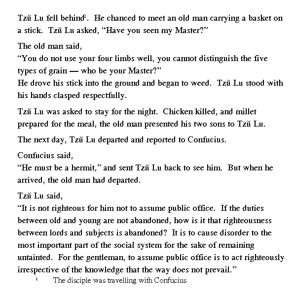 Цзы Лу, следуя за [Кун-цзы], однажды далеко отстал от него. По дороге он встретил старца с тяпкой на плече. Цзы Лу спросил:
