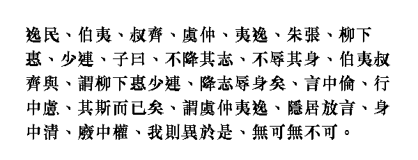 ≈ Неразумно отказываться от службы. Нормы отношений между старшими и младшими отменить невозможно; как же можно отменить справедливые принципы отношений между правителем и чиновниками? Тот, кто хочет остаться чистым, нарушает эти принципы отношений между правителем и чиновниками. Благородный муж идет на службу, дабы выполнить свой долг, а о том, что его Дао-Путь неосуществим, он знал заранее.