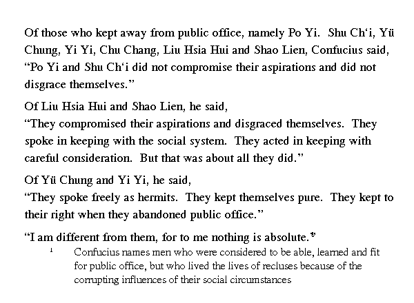 ≈ Живя в уединении, они были свободны в речах, сохранили чистоту нравов; показали умение приспосабливаться к обстоятельствам, удалившись от мира сего. В отличие от них, я заранее не предрешаю ничего, руководствуюсь лишь чувством долга1.