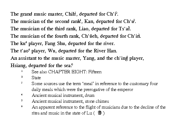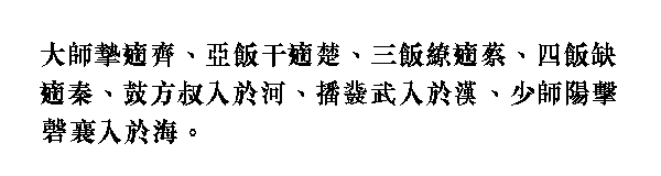 Главный музыкант Чжи бежал в Ци, музыкант при завтраке Гань бежал в Чу, музыкант при обеде Ляо бежал в Цай, музыкант при ужине Цюэ бежал в Цинь, барабанщик Фан Шу удалился на берег Хуанхэ, музыкант У, играющий на ручном барабане, переправился на другой берег реки Хань, помощник главного музыканта Ян и играющий на каменном гонге Сян бежали за море1.