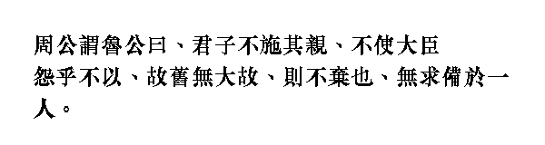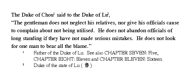 ≈ Благородный муж никогда не отдаляет родственников, не доводит крупных сановников до роптания из-за того, что их советам не внемлют, не отдаляет старых друзей, если нет этому серьезных причин, не требует, чтобы в одном человеке совмещались все благородные достоинства1.