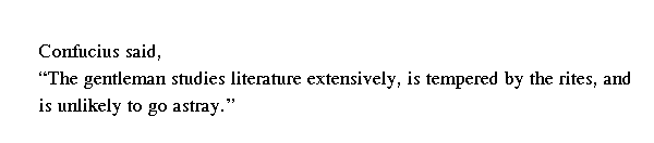 Учитель сказал: "Если благородный муж, многому учась из книг, ограничивает себя правилами этикета, он в состоянии не изменять [принципам]".