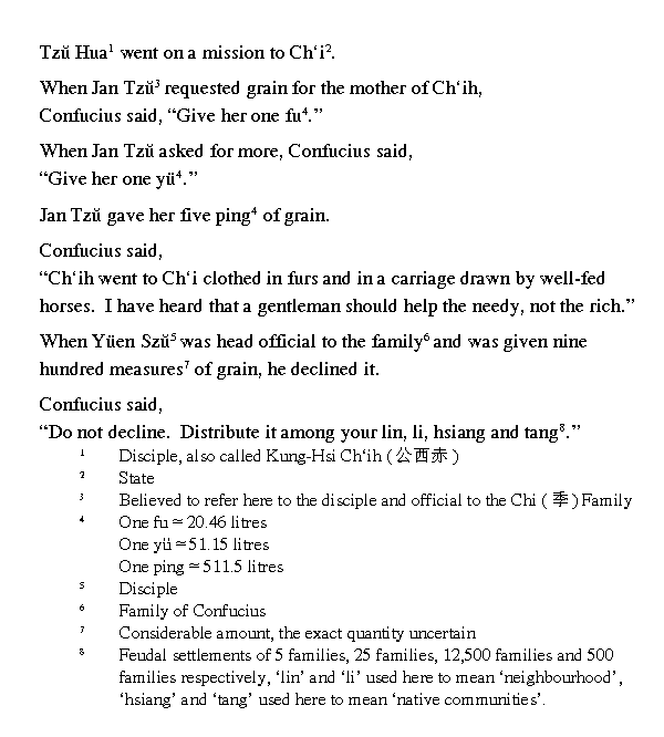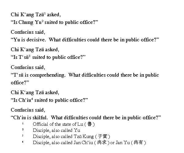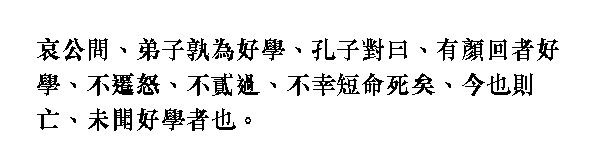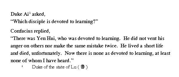 Ай-гун спросил [учителя]: "Кто из ваших учеников самый прилежный в учении?" Кун-цзы ответил: "Самым прилежным в учении был Янь Хуэй. Он не срывал свой гнев на других, не повторял ошибок. К несчастью, жизнь его была короткой, он умер. Теперь нет такого человека, я не знаю, кто бы был так прилежен".
