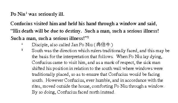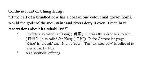 Обычно тягловый скот не использовали для жертвоприношений. Чжун Гун был сыном простого земледельца (╚тягловым бычком╩), но для талантливого человека, каковым и был ученик Конфуция, происхождение не имеет значения, утверждает Учитель.