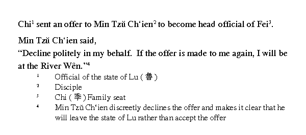 Минь Цзыцянь (Минь Сунь) ≈ ученик Конфуция. Своей приверженностью принципам человеколюбия он выделялся даже среди учеников Конфуция. Отказ от службы, тем более не у государя, а у аристократа, стал впоследствии, особенно в эпоху Хань (III в. до н.э. ≈ III в. н.э.), одним из критериев благородного мужа.
