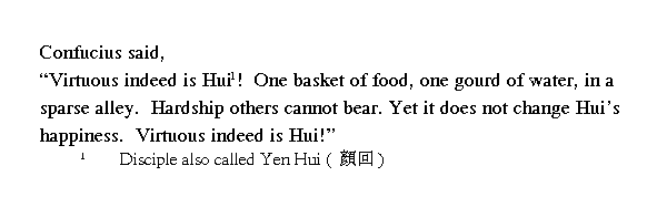 Учитель сказал: ╚О, как мудр Хуэй! Он довольствуется одной чашкой риса и утоляет жажду из тыквенной корки, живет в ветхой лачуге. Другие не вынесли бы таких лишений, а он всегда доволен. О, как мудр Хуэй!╩