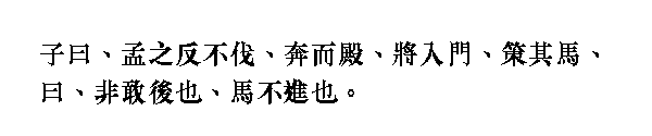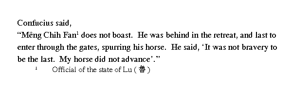 Учитель сказал: ╚Мэн Чжифань не хвастался своими заслугами. Когда его войско отступало, он уходил самым последним, прикрывая воинов. Только когда [отступающие] достигли городских ворот, он наконец стегнул своего коня, сказав: ⌠Я не посмел бы быть позади, да конь противился скакать вперед■.╩