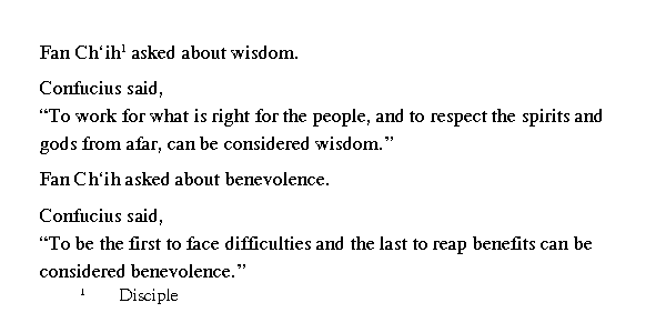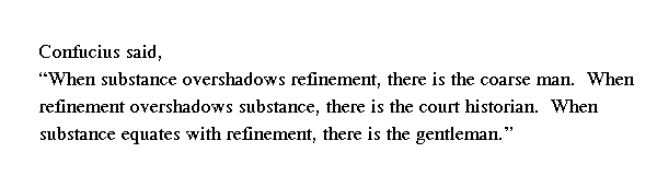 Учитель сказал: "Когда в человеке одерживает верх чжи (свойства самой натуры), получается дикарство (е); когда же одерживает верх вэнь (образованность), получается одна ученость (ши). Только соединение свойств самой натуры и образованности дает благородного мужа╩.