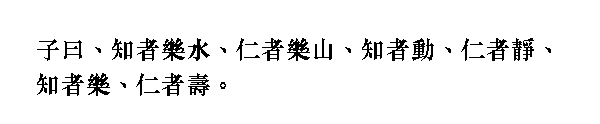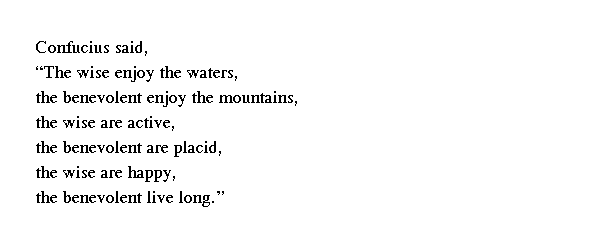 Учитель сказал: "Мудрый любит воду. Обладающий человеколюбием наслаждается горами. Мудрый находится в движении. Человеколюбивый находится в покое. Мудрый радостен. Человеколюбивый долговечен".
