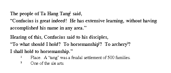 Человек из дана Дасян сказал: "Как велик Кун-цзы! Ученость его огромна, но он пока ни в чем не прославился!"