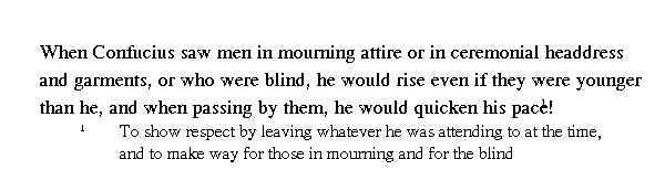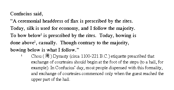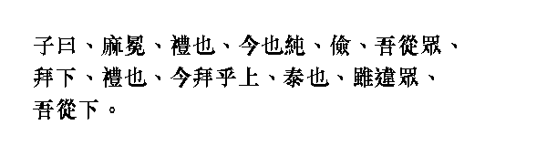 Учитель сказал: "По Правилам шапки должны быть из пеньки, но ныне их делают из шелка. Это дешевле, и я следую за всеми. По Правилам следует [правителю] кланяться внизу у входа в залу, ныне же кланяются, когда он уже поднялся. Но вопреки всем, хотя это и вызывающе, я буду кланяться внизу".