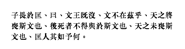 Когда Учителю угрожали в Куане, он сказал: "После смерти [чжоуского] Вэнь-вана я - тот, в ком вэнь-культура. Если бы Небо поистине хотело уничтожить вэнь-культуру, то оно не наделило бы ею меня. А коль само Небо не уничтожило ее, стоит ли бояться каких-то куанцев?"