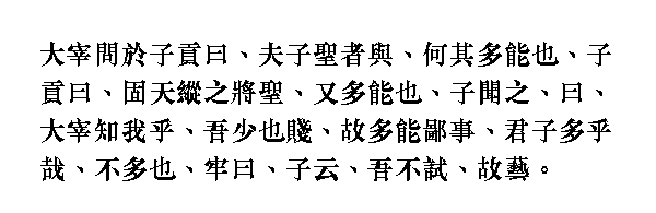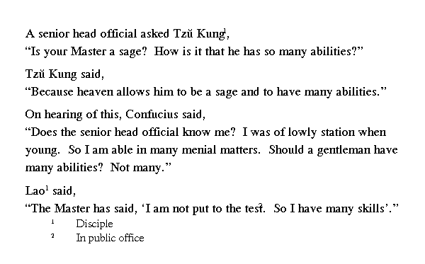 Учитель, услышав его, сказал: "Первый министр знает меня. В детстве я жил бедно и поэтому научился многому такому, что не имеет никакой ценности. Но разве благородный муж должен обладать способностями ко многому? [Он] не должен уметь делать многое".