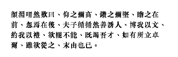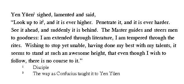 Янь Юань со вздохом сказал: "Чем больше [я] всматриваюсь в учение [Учителя], тем возвышеннее оно кажется; чем больше стараюсь проникнуть в него, тем тверже оно оказывается. [Я] вижу его впереди, но вдруг оно оказывается позади. Учитель шаг за шагом искусно завлекает людей, он расширяет мой ум с помощью образования, сдерживает меня посредством ритуала. Я хотел отказаться [от постижения его учения], но уже не смог; я отдал все свои силы, и кажется, что его учение находится передо мной, я хочу следовать ему, но не могу этого сделать".