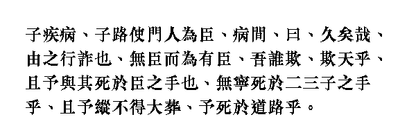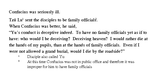 Когда болезнь прошла, Учитель сказал: "Ю давно занимается этим ложным делом! Претендовать на почести, оказываемые сановнику, когда я не являюсь сановником, кого я этим обманываю? Я обманываю небо! Кроме того, разве умереть на руках у подданных лучше, чем умереть на руках своих учеников? И хотя мне не будут устроены великие похороны, разве я умру посреди дороги?"