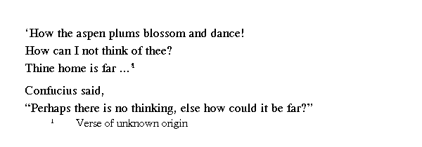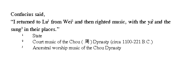 Учитель сказал: ╚Лишь после того, как я возвратился в Лу из Вэй, музыка была исправлена, оды и гимны были упорядочены.╩