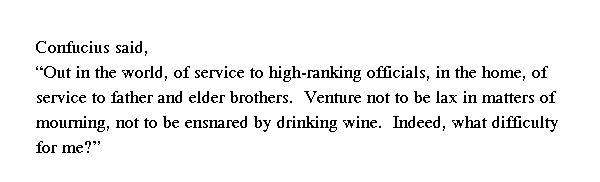 Учитель сказал: ╚Во внешнем мире служить правителям и сановникам, дома служить отцам √ старшим братьям, не сметь не усердствовать в делах похоронных и не пьянеть от вина √ что из всего этого трудно для меня?╩