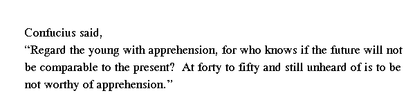 Учитель сказал: "На молодежь не следует смотреть свысока. Откуда нам знать, сравнится ли следующее поколение с нами? Но если человек к сорока-пятидесяти годам не достиг ничего путного, то он не заслуживает уважения".