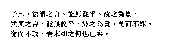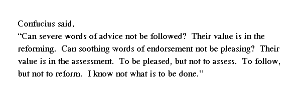 Учитель сказал: "Можно ли не принимать справедливые советы? Но они ценны только тогда, когда сам исправляешься. Можно ли не радоваться желанным словам? Но они ценны только тогда, когда сам задумываешься над ними. Однако если человек радуется, но не задумывается, принимает [советы], но не исправляется, с таким человеком я ничего не могу поделать"