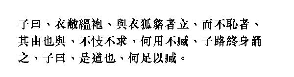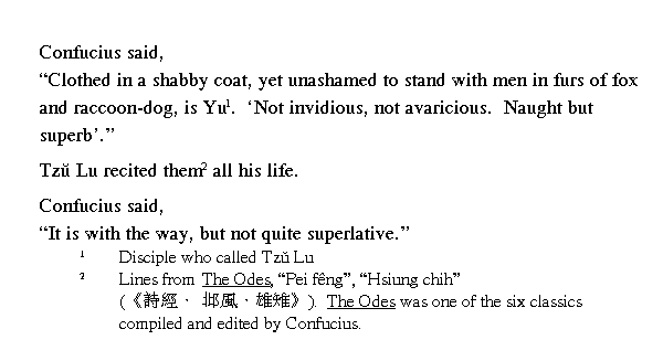 Учитель сказал: "В рваном халате на старой вате может не стыдиться стоять рядом с одетым в лисью или енотовую шубу, пожалуй, только Чжун Ю! В ╚[Книге] стихов╩ говорится: ╚Не завидует, не заискивает, разве не может он быть добрым?╩