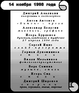 14 ноября собравшиеся совершили "Путешествие в лето(у)". Что имели в виду организаторы вечера, понять так и не удалось: на это название мало обращали внимания как выступающие, так и публика. Вилли Мельников продемонстрировал фотопоэзоприсутствие: стихи на не вполне (сверх?) русском языке сопровождались фотокартинами, двигавшимися вокруг автора подобно планетам вокруг звезды. Выступление завершилось поэтическим гобеленом - от потолка до пола - сотканным из текстов на многочисленных языках. Стихи читали также Антон Антонов и Игорь Сид (выступление Сида было поддержано огромным портретом Максимилиана Волошина, который организаторы изготовили компьютерным способом специально для этого вечера). Вера Сажина свои стихи интонировала голосом, подчас забывая про слова и выводя чистый звук горлового пения. Исполнение совпровождалось постукиванием на каком-то шаманском ударном инструменте, похожем на колотушку сторожа или детскую игрушку. Игорь Бурдонов показал литературный перформанс в духе группы "Коллективистские действия". После прочтения "предисловия издателя" к "Рукописи, найденной в тумбочке 27 апреля 1994 года" выяснилось, что в тумбочке были найдены только эпиграфы не то к отсутствующему, не то к ненаписанному произведению. Эпиграфы были розданы присутствующим, которые их по очереди читали, а "издатель" добавлял свои "примечания". Половина эпиграфов взяты из предисловий к разнообразным книгам, а половина представляла собой высказывания об Игоре Бурдонове различных людей, включая самого Игоря Бурдонова. В завершение автор объявил, что публикация - это смерть литературного произведения и, поскольку "Рукопись" прочитана, она должна умереть: эпиграфы собрали, засунули в камин и сожгли. Герман Лукомников прочитал только одно стихотворение, после чего по просьбе публики - ещё пару десятков стихов на выбранные буквы "е" и "м". Работы Дмитрия Авалиани уже давно стали одним из элементов организации пространства клуба. Автор выступил с новыми анаграммами, листовертнями и палиндромами. Дмитрий Широков представил сверчков: проза читалась автором, керамические сверчки стояли на столе, живые стрекотали в банке, а жареные Дмитрий пообещал желающим дать попробовать в конце вечера. Паузы между выступлениями заполняли Александр Кувшинов (блок-флейта), Алексей Сухоручкин (блок-флейта, кларнет, саксофон) и Василий Давыдов (варган, барабан). Когда выступления закончились и погас свет, музыканты исполнили что-то шаманское, со светящимся барабаном и заунывным пением. Всё закончилось чаепитием. Следующий вечер на Войковской, как сообщил Александр Белугин, состоится в декабре, его рабочее название "Вечер года". На этот раз должно быть что-то тихое и лирическое.