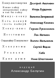 Ведущий Александр Белугин Он прочитал несколько хайку белорусских поэтов в переводах Александра Привалова, любезно предоставленных для этого вечера Дмитрием Кузьминым. |