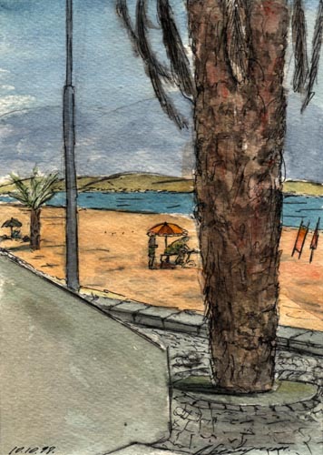 Эйн Бокек - название ущелья Иудейских гор, около которого расположен курортный городок. А меня в первую очередь поразила пальма - ее толстый, высокий ствол. "Ничего себе травка (ведь пальма - это трава, а не дерево)", - подумал я и нарисовал ее.