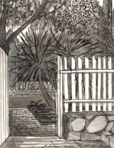 Этот рисунок - первый, который я сделал в Израиле в первый день моего пребывания там. Утром, до завтрака, я вышел из дома, сел на камень и стал рисовать калитку. Наполовину я еще оставался в Москве, поэтому рисунок получился черно-белым. Она написан тушью и пером. Калитка ведет в дом моих друзей по фамилии Каган. Они живут в городе Реут Макабин, что в 40 км севернее Тель-Авива в сторону Хайфы. А познакомился я с ними в Москве, где они жили пять лет. За эти годы сад вокруг их дома пришел в запустение. Там было много валяющихся камешков, из которых я сделал для своих друзей маленький сад камней.