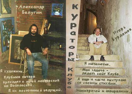 Однажды в один из зимних вечеров 1997 года в мастерскую к Саше Белугину пришли друзья. Но не просто попить чай, а провести философский семинар на странную тему "Передвижение ледников, Времена года и Жизнь ёжиков". При этом почему-то читались стихи и исполнялась музыка. Неожиданно для всех встреча оказалась приятной, интересной и тёплой, несмотря на холод под высокими сводами мастерской. После нескольких таких "семинаров" как-то само собой вечера стали регулярными, сложился коллектив как выступающих, так и гостей. Так возник наш Клуб. Нам не пришлось придумывать для него название - за нас это сделали слесари из ЖЭКа, намалевав на железной двери мастерской: "Подвал #1". Так это ироничное название закрепилось за Клубом, хотя один из поэтов может быть более точно определил это место как "островок тонких излучений". Итак, примерно раз в месяц живописная мастерская художника А.Белугина превращается в клуб "Подвал #1". Поэты читают стихи, музыканты играют музыку, художники показывают картины, философы размышляют вслух. Кто умеет двигаться - танцует. У кого есть голос - поёт. У кого есть что-то ещё - делает что-то ещё. А кто-то снимает всё это на видео и фото для себя и других. Из всей этой творческой кутерьмы получаются хэппенинги, артефакты, инсталляции, перфомансы и другие иностранные слова. По сложившейся традиции, вечер завершается общепримиряющим чаепитием. На самом деле, все случайности вечера запланированы, экспромты подготовлены, а импровизации тщательно отрепетированы. У каждого вечера есть свои режиссёры, сценаристы и продюсеры. Всё идёт по заранее обговорённому плану и в соответствии с единой идеей, выраженной в названии вечера, а иногда даже - в противовес главной идее. Если что-то идёт не так, как запрограммировано, - это тоже входит в программу. Если говорить серьёзно, Клуб "Подвал #1" предназначен для обмена творческими подарками. Это мастерская, где в одном ряду с профессионалами своего дела выступают и новички. Первые на один вечер становятся новичками, пробуя свои новые и рискованные идеи. Вторые на один вечер становятся профессионалами, выступая перед публикой. Впрочем, публика на наших вечерах - понятие условное. В любой момент вы можете стать участником действия. Принимаются любые идеи и пожелания. Так что, всё возможно на этих вечерах. Смысл вечера кураторы Клуба видят не в профессионализме и художественности, а в свободном творчестве в рамках основного замысла или идеи вечера, всестороннем показе этой идеи и разных подходов к её раскрытию. Наш Клуб - это модель некоей вселенной с присутствующими в ней мирами и антимирами. Поэтому и посетителем вечера становится близкий по духу человек, присутствие которого заранее оговаривается. |