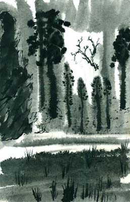 Тушь - это инь китайской живописи, также как кисть - ян. Тушь бледная, во-первых, потому, что слабая (иньская дважды - удвоенная триграмма Кунь), а, во-вторых, потому что это только самое начало пути.